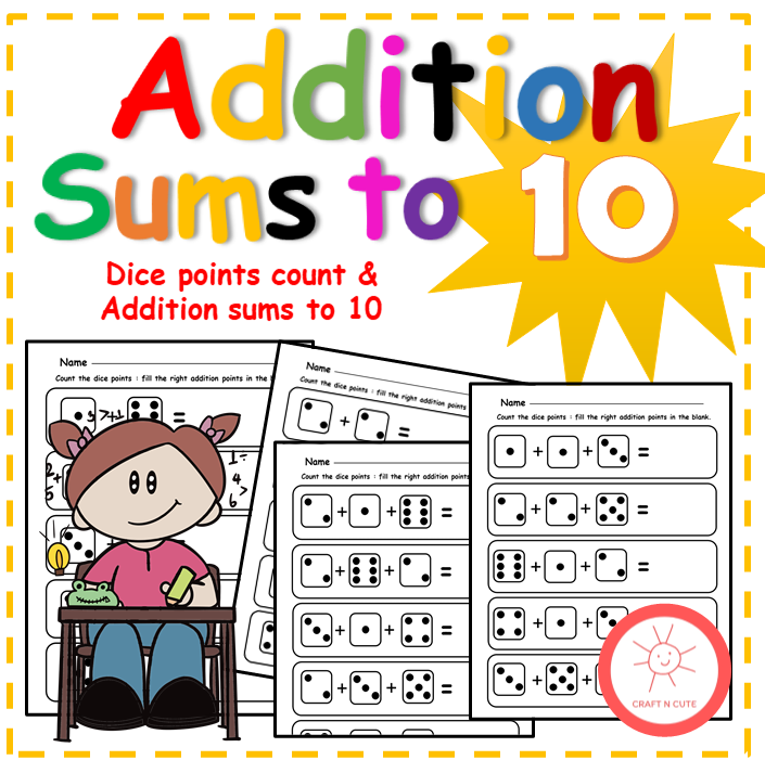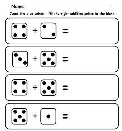 - First 12 different pages for teachers to practice their students about counting and addition skill, counting the dice points, addition from 2 dices and get the result.